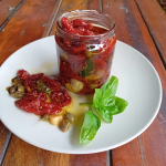 Sonnengetrocknete Tomaten aus umserem Garten, mit Kapern, Knoblauch und frischem Basilikum in Öl eingelegt.