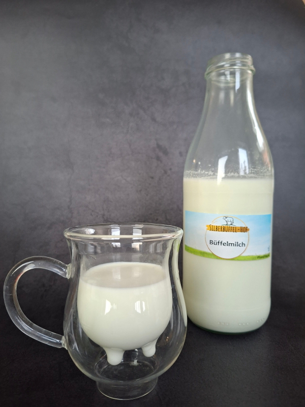 Ihre Milch schmeckt sehr sahnig, mild, abgerundet und ist sehr gehaltvoll mit 8% Fett und mehr. Wer nicht unbedingt auf seine schlanke Linie achten muss, erhält dadurch auch viel mehr an gesunden essentiellen Fettsäuren. Zudem liefert die Milch unserer Büffel mehr Calcium, Biotin, Vitamin C, Vitamin A und mehr als doppelt so viel Eisen als Kuhmilch.